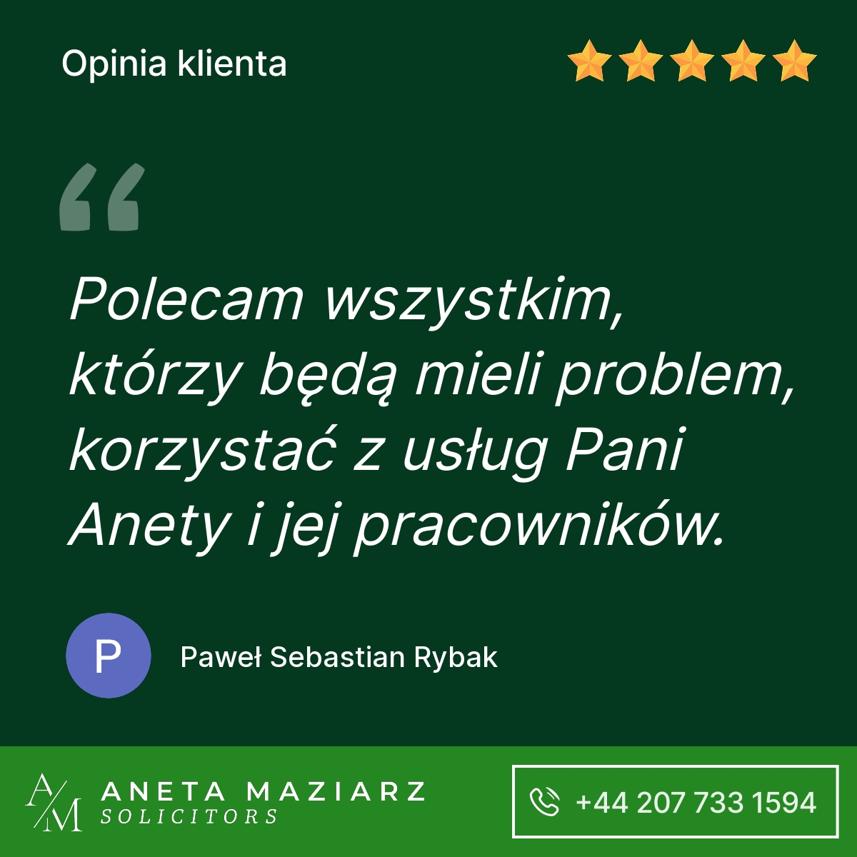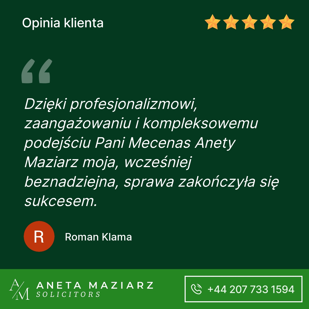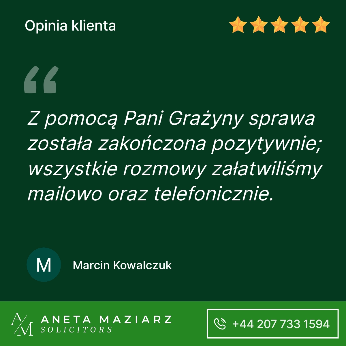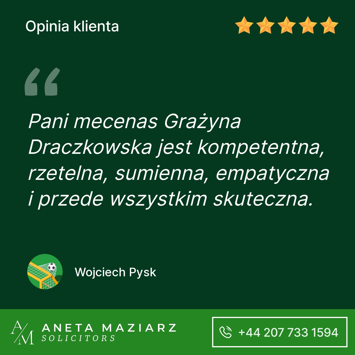 Polecam Kancelarię Pani Anety Maziarz Solicitors. Profesjonalnie podeszli do mojej sprawy która zakończyła się pozytywnie dla mojej firmy.