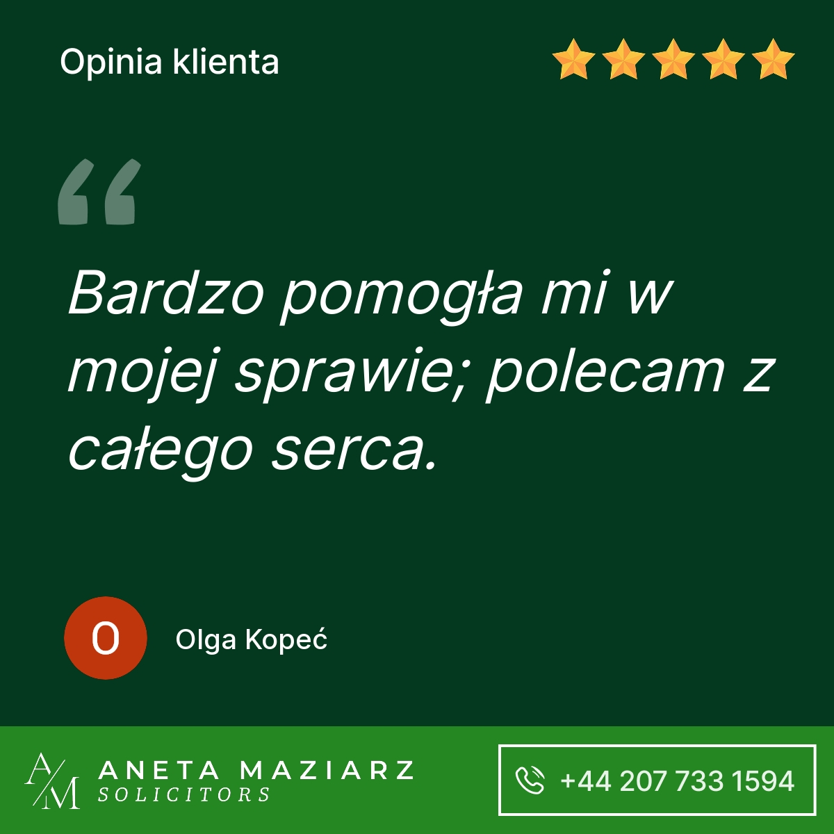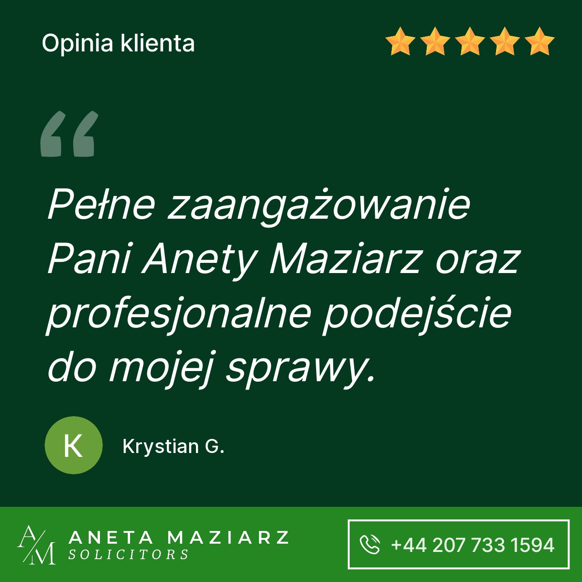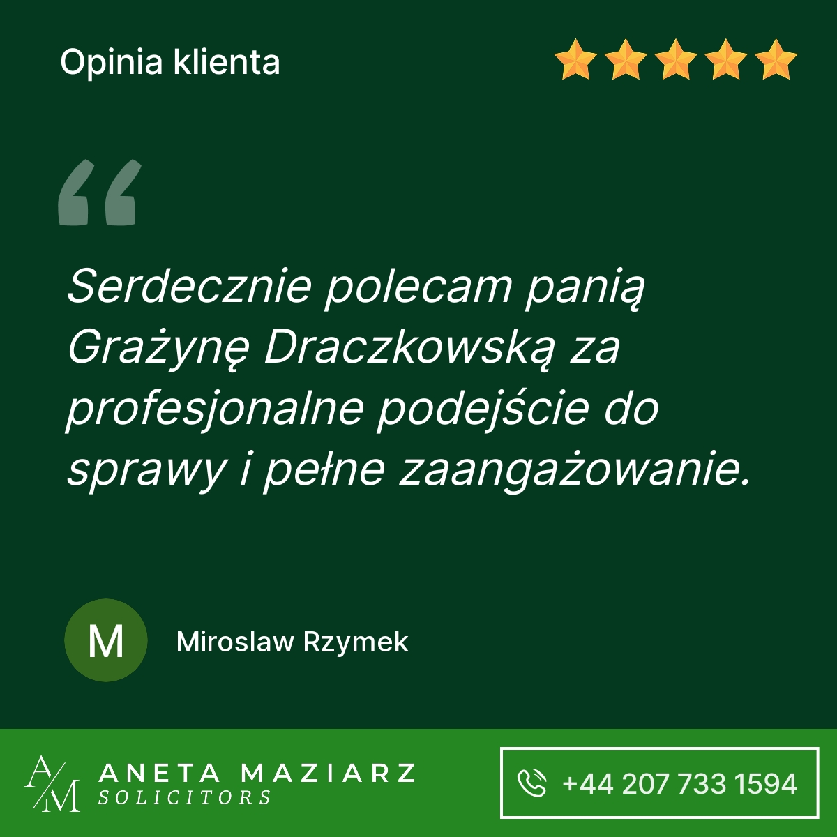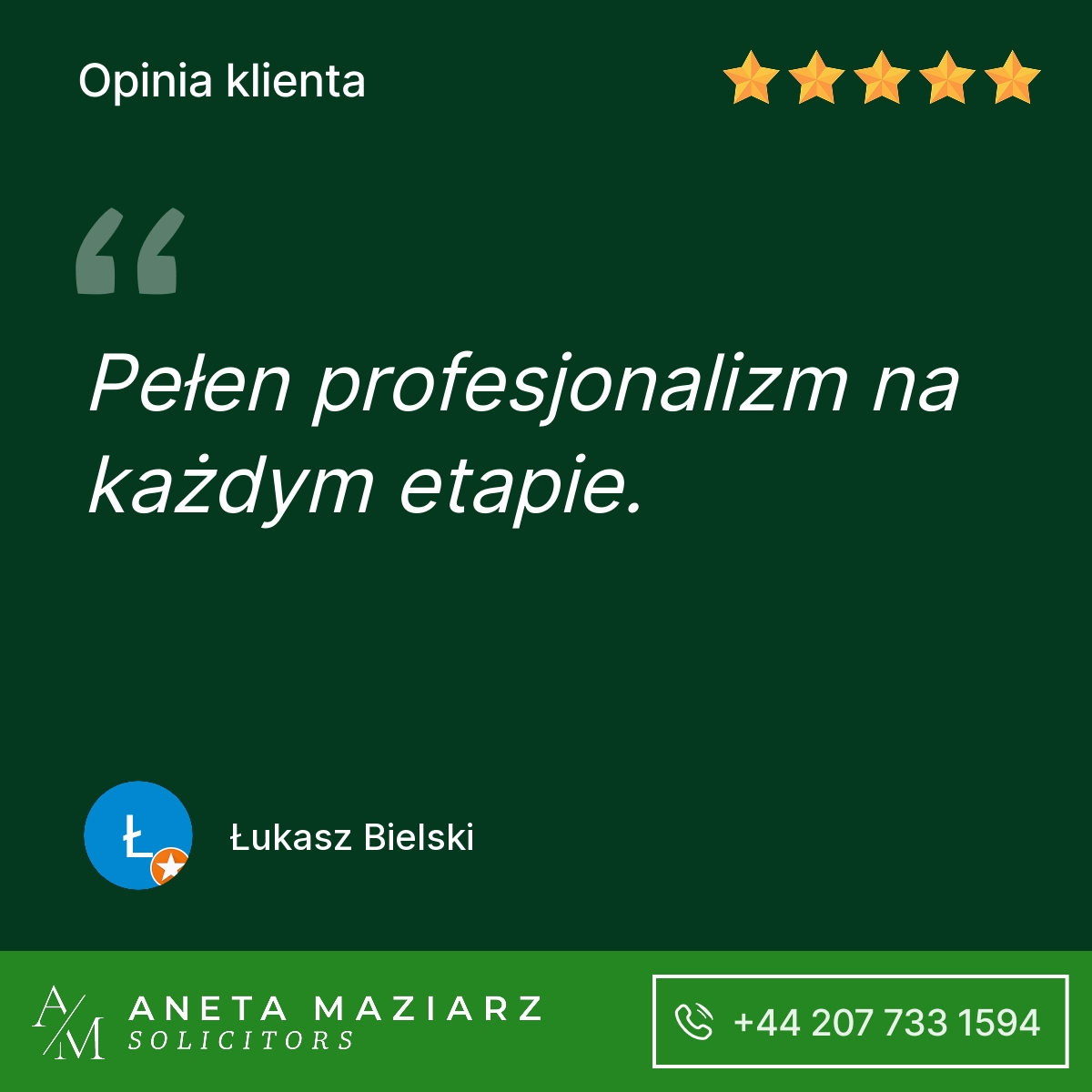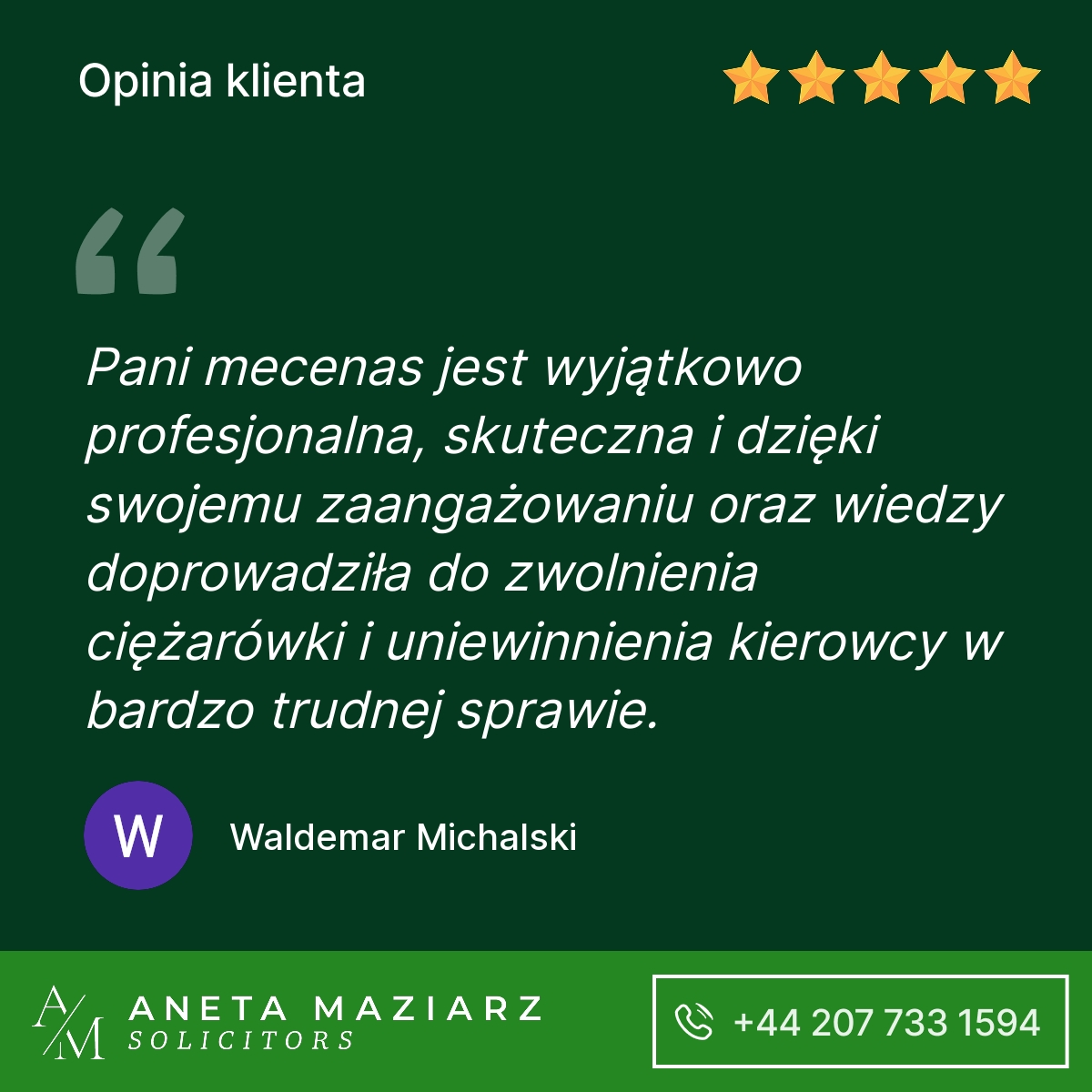 Polecam Kancelarię Pani Anety Maziarz Solicitors. Profesjonalnie podeszli do mojej sprawy która zakończyła się pozytywnie dla mojej firmy.